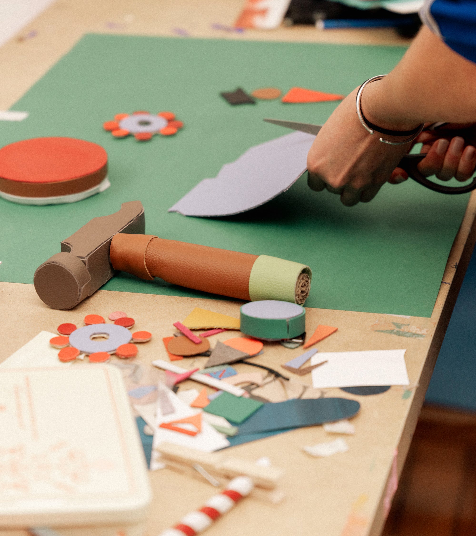 Artiste et réalisatrice, Alix Bortoli façonne des histoires et des films à la main. Du bois à la céramique, du papier au cuir, elle explore la matière, image par image, suivant un processus créatif long et complexe qui ne révèle sa magie qu’une fois le bouton « play » pressé. Pour notre capsule de Noël, elle a imaginé trois vidéos réalisées à partir de chutes de cuir de nos ateliers : une fabrique miniature, peuplée de personnages, hommage au cuir, à l’artisanat, et à la poésie du geste. Son univers coloré et rêveur se prolonge également dans nos vitrines du 5 novembre au 26 décembre, où cette artiste parisienne formée à Londres prendra temporairement ses quartiers pour mieux célébrer la créativité et l’esprit de Noël.
