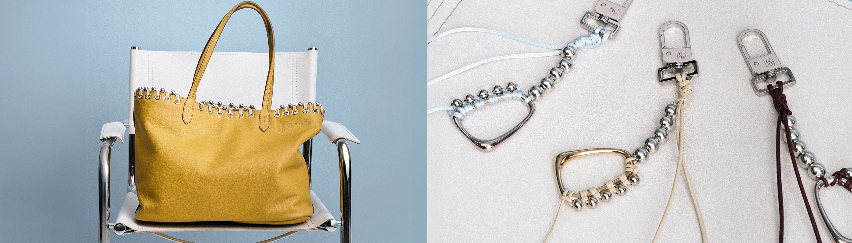 Nous avons aussi créé des grigris de sac à partir de mousquetons issus des stocks de la Maison, que nous avons re-tressés différemment. Ces charms sont des objets hybrides, qui habillent un sac, mais que l'on peut aussi accrocher à un jean, à un tote bag ou à son trousseau de clés.