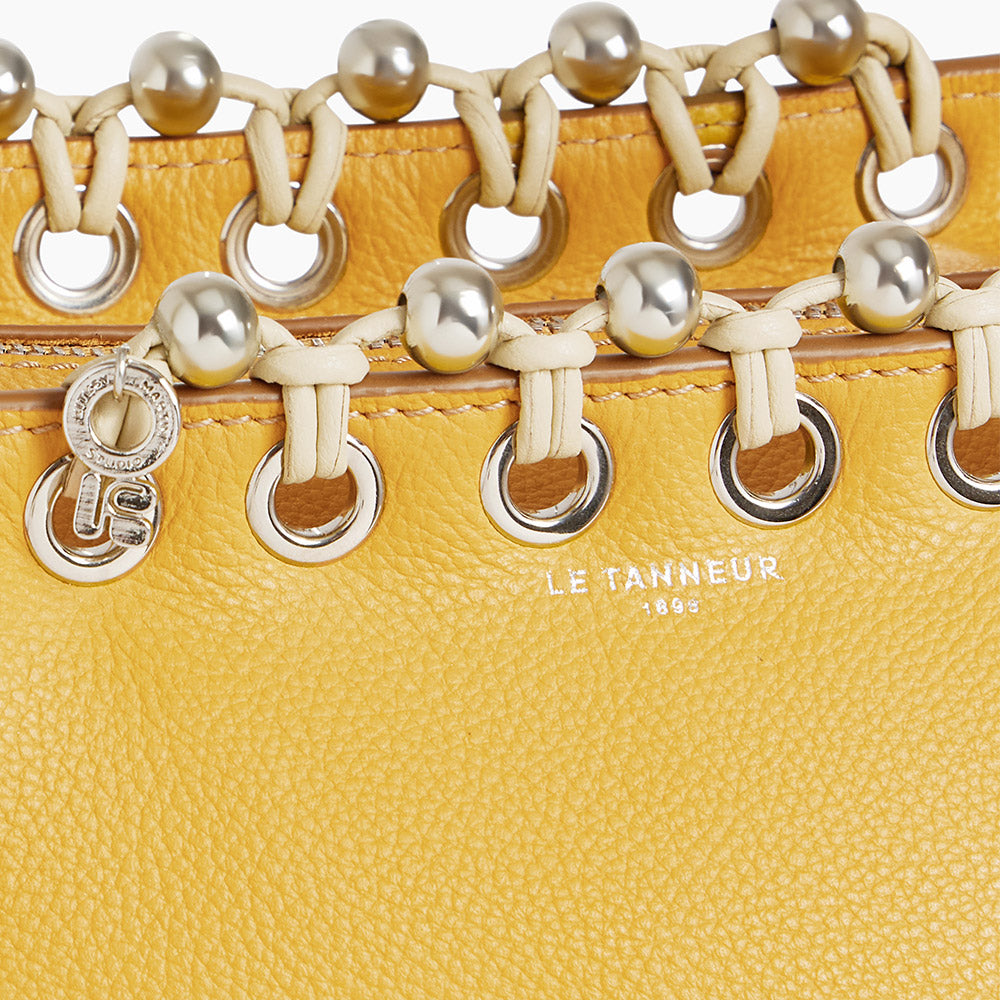 Je suis arrivée dans la bijouterie par le design textile. Je travaille donc le bijou d’une manière différente d’un artisan joaillier ou un designer spécialisé. Avec Le Tanneur, l’idée était de créer un sac-bijou en partant du sac Louise. Nous avons intégré à notre tressage des perles métalliques, posé des œillets pour un effet « bijou ».