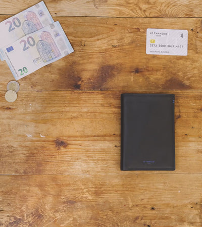 Ce portefeuille grand format vertical arbore un discret marquage Le Tanneur couleur Le Bleu, ainsi qu’un double point du même contraste cousu à la main.