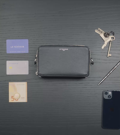 Sacoche portefeuille zippée avec bandoulière ajustable et amovible. Zip et marquage Le Tanneur finition argent.